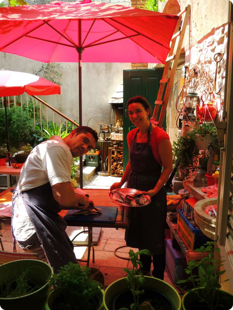 Private day of cooking with chef Tatjana Ciciliani, in Trogir, at her home in a 13th century palace! Here, Jonathan and Tatjana are prepping fish…Best experience of the trip!