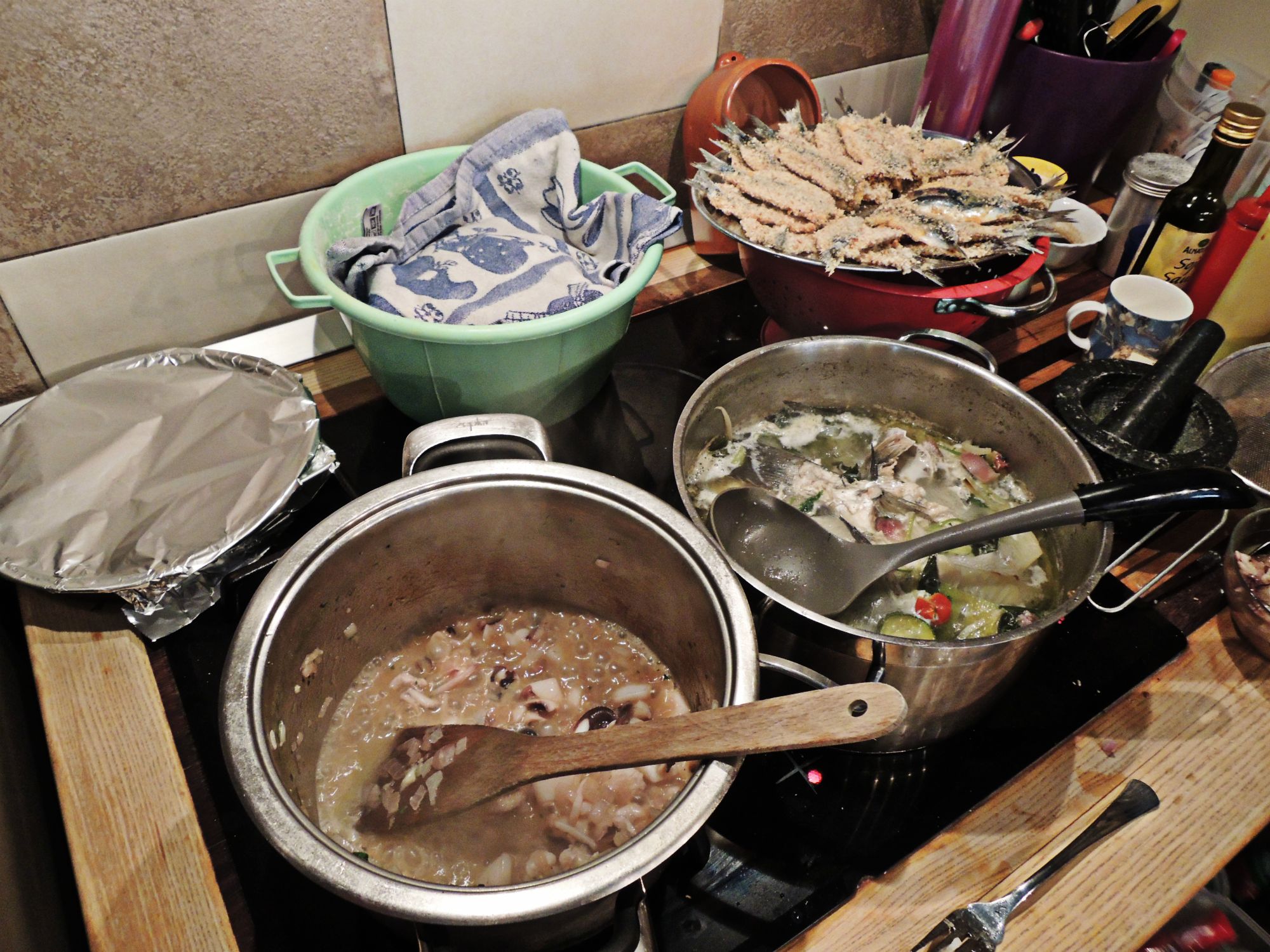 We got all this going on and more…risotto, fish stock, fried sardines and bread rising