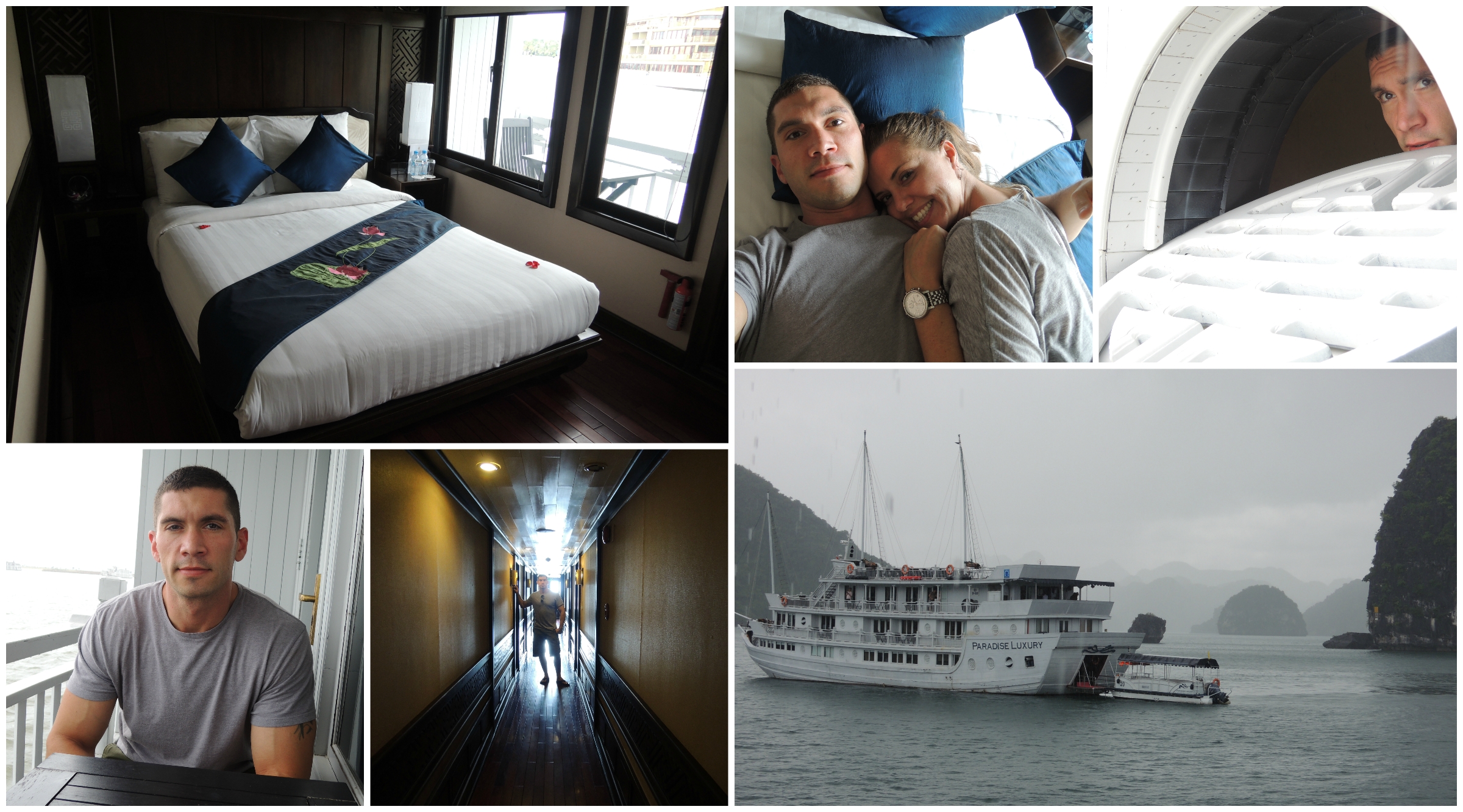 After looking at several options, we choose to book our overnight cruise to Ha Long Bay through Paradise Cruises. This company was one of the few that had spacious rooms with balconies as an option. We booked and were very happy with our room. The energy on the boat was quite low from most passengers. This did put a bit of a damper on our stay since we like to eat, drink and be merry. We still did…just by ourselves! Towards midnight, we heard a boat that appeared to be having way more fun – great music, cheering and excitement echoed from their boat. Ours was quiet and dim by that time. So warning – if you are looking for a party boat or want to socialize and meet new people, then you should try a different boat.